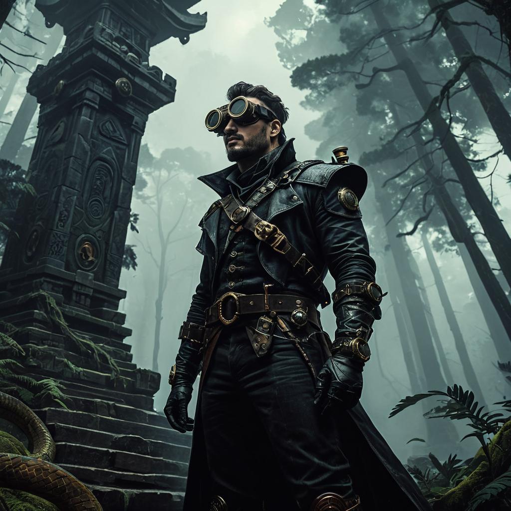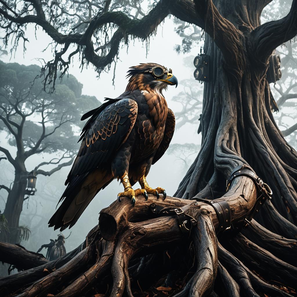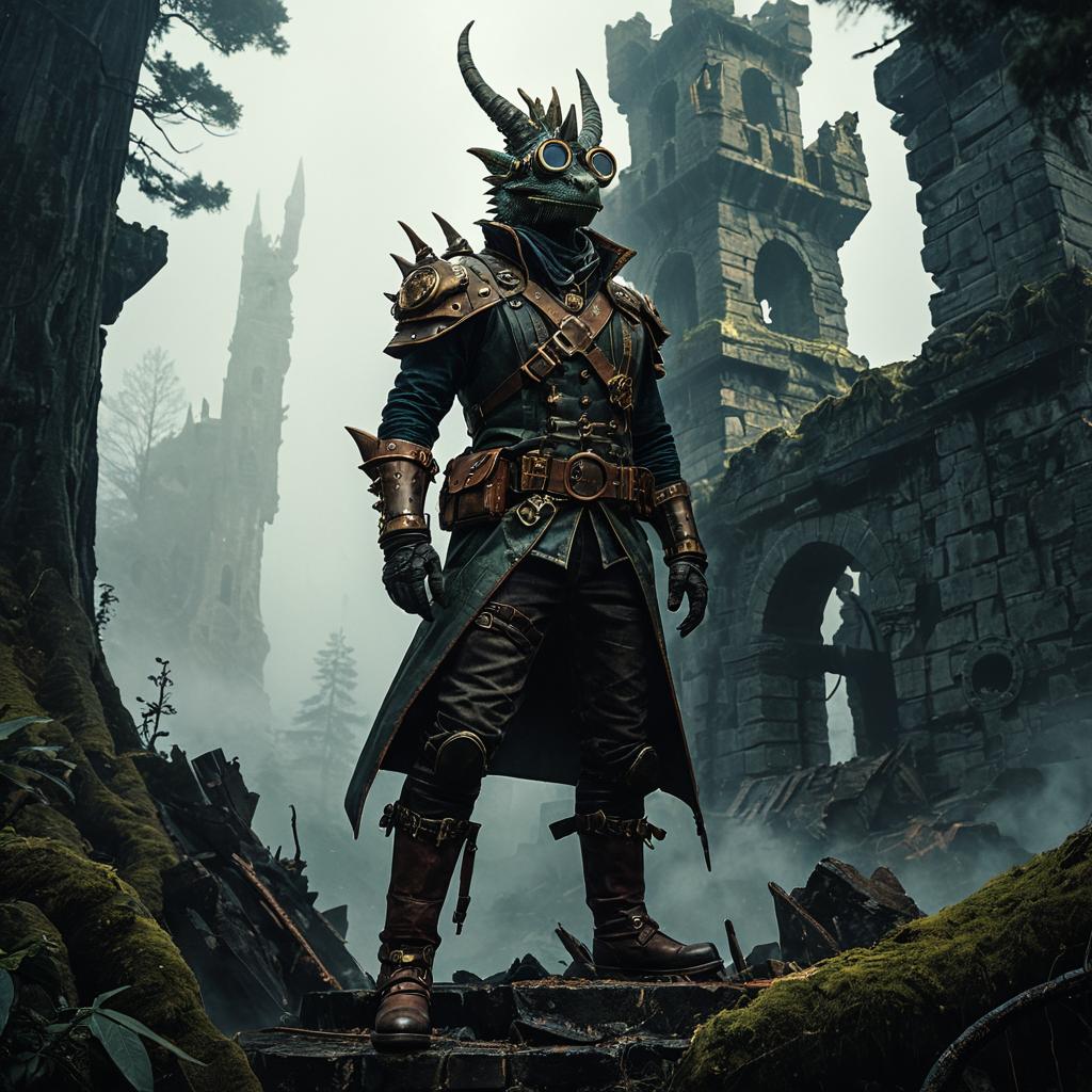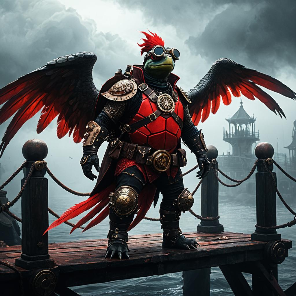 A majestic anthropomorphic crimson phoenix turtle stands atop a fog-covered ancient pier, wearing a leather harness and steampunk goggles, cinematic chiaroscuro lighting, digital painting, concept art, artstation, matte finish, sharp focus, illustration, by Magali Villeneuve, Greg Rutkowski, Lois van Baarle