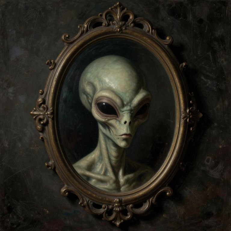 This digital painting depicts a portrait of an alien with a greenish, translucent skin tone and large, black, almond-shaped eyes. The alien's head is bald, with a smooth texture, and it has a slender, elongated neck. Its expression is neutral, almost solemn. The portrait is framed in an ornate, oval, golden frame with intricate, baroque-style detailing. The background is dark and textured, creating a contrast that highlights the alien's face. The overall style is realistic with a slight gothic or horror aesthetic. The image is centered in the frame, drawing immediate attention to the alien's face.