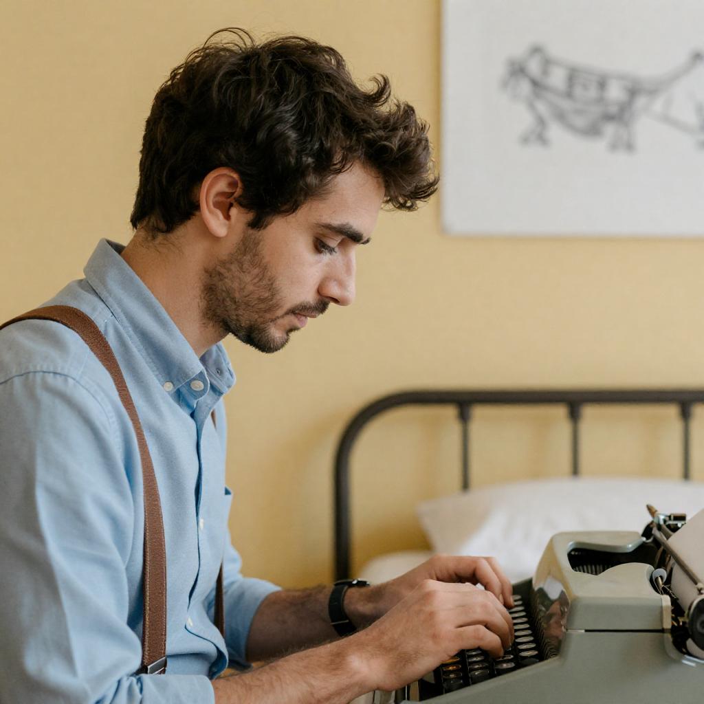 Photograph of a man with dark, slightly wavy hair and a light beard, wearing a light blue shirt with brown suspenders, typing on an old-fashioned typewriter. He has a focused expression. Yellow wall in the background with a sketch and a metal bed frame. Soft, natural light. Man in profile, facing right.