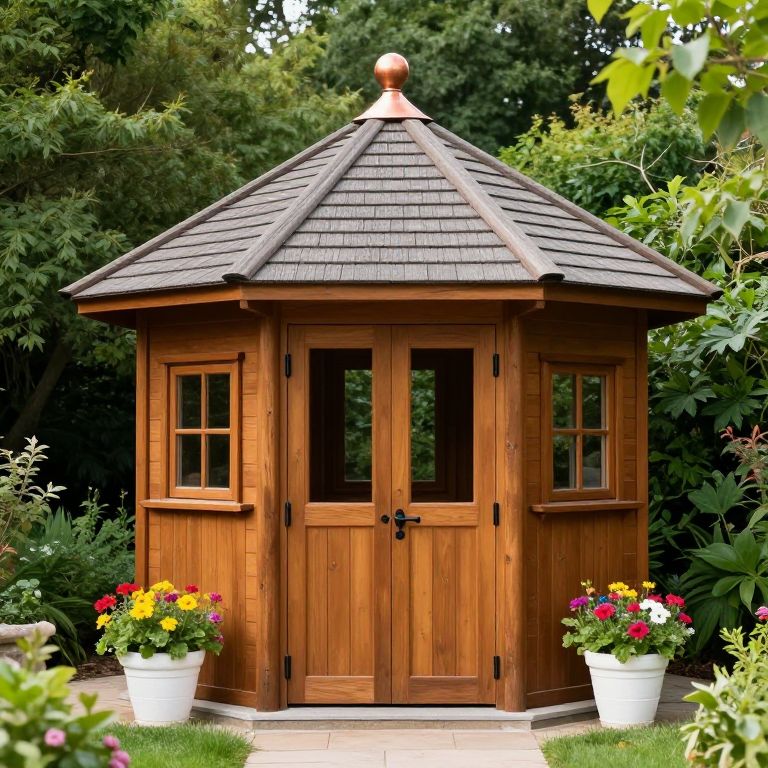 Hexagonal wooden shed with a shingled roof and copper finial stands prominently in a landscaped garden, featuring double doors with black hinges, two square windows, and flanked by white planters holding vibrant flowers, set against a backdrop of lush greenery.