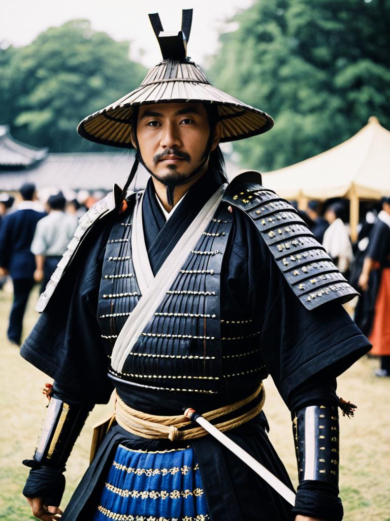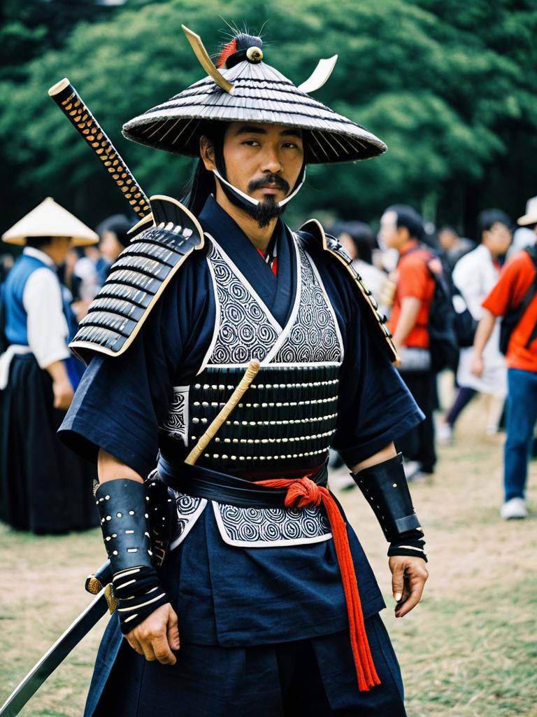 Man in Samurai Costume, cosplay festival photo, photorealistic realism