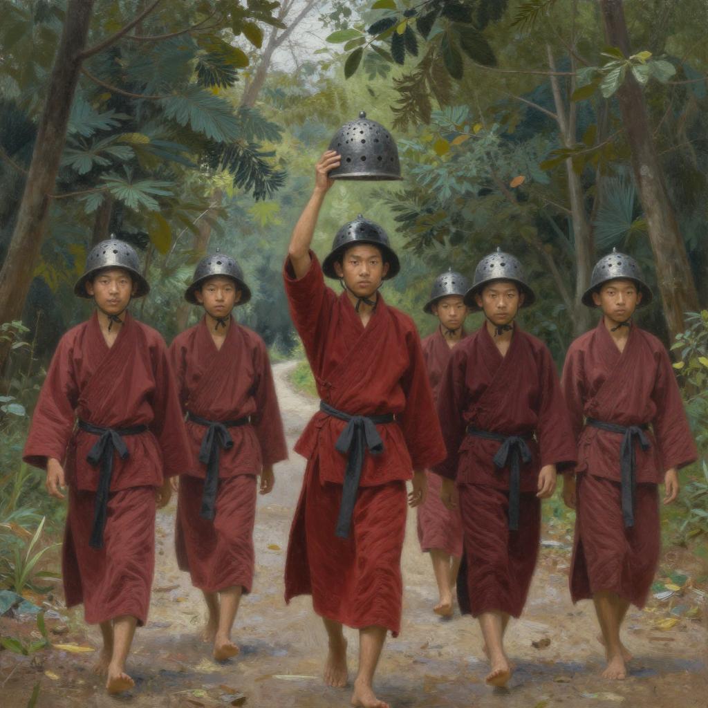 Nature, bald, multiple boys, forest, helmet, realistic, 6+boys, outdoors, traditional media, painting (medium), photorealistic, tree, male focus, holding, scenery, day, barefoot, robe, road, photo background, standing, red robe, walking