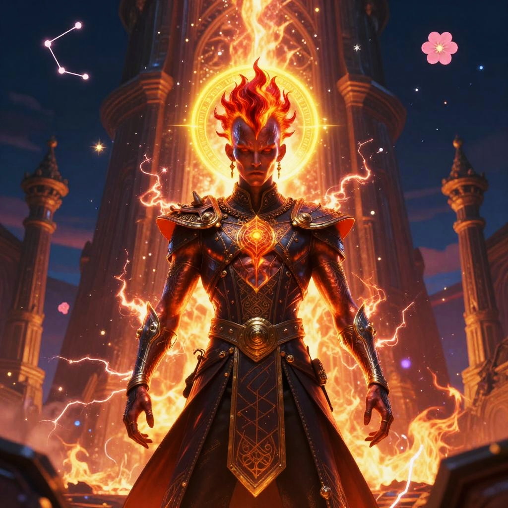 Surreal, vibrant portrait of varen, a stoic warrior with fiery crimson mohawk and burnished copper-toned glowing skin, set within a colossal forge temple blazing amidst a storm of crackling electric flames in nightfall. They wear an ornate dark uniform with gold accents and arcane sigils; a radiant yellow halo crowns their head as stars scatter across a cobalt sky. Pink flowers drift among constellations, luminous hues, dreamy atmosphere, baroque cyber-fantasy with metallic textures and vivid sparks of dynamic illumination.