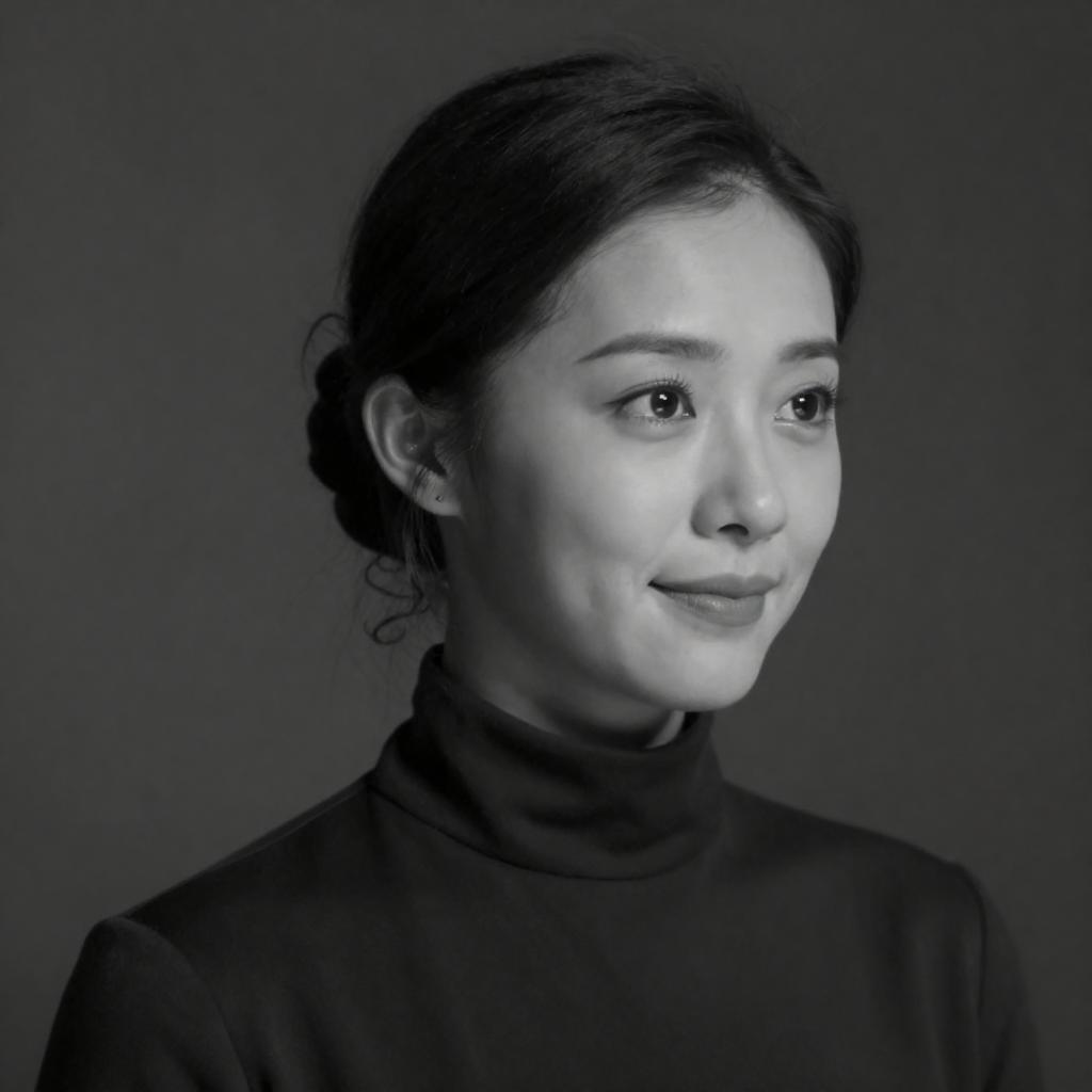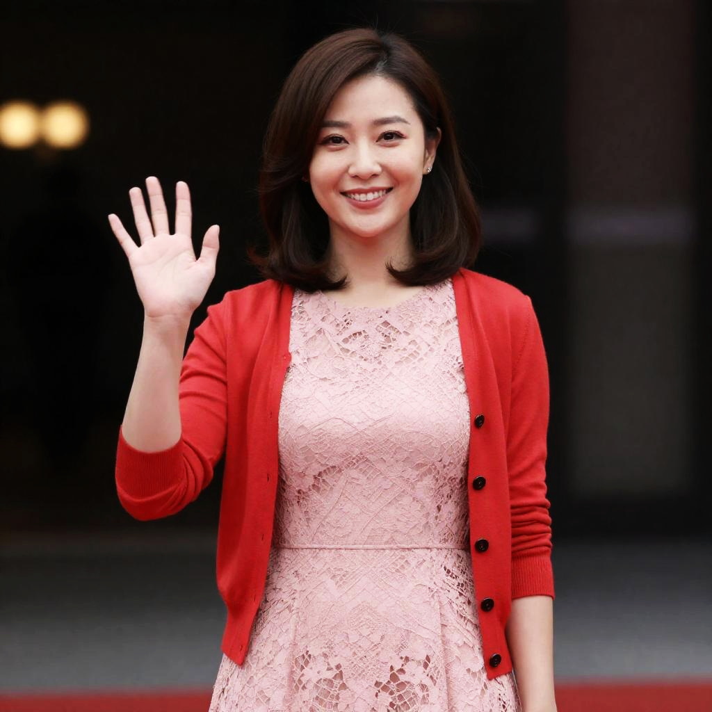 A young Asian woman with long, wavy brown hair smiling broadly, holding a microphone in her right hand. She is wearing a black dress adorned with floral brooches and a dark green patterned jacket. The background is a dimly lit stage, emphasizing her presence as she stands facing forward.