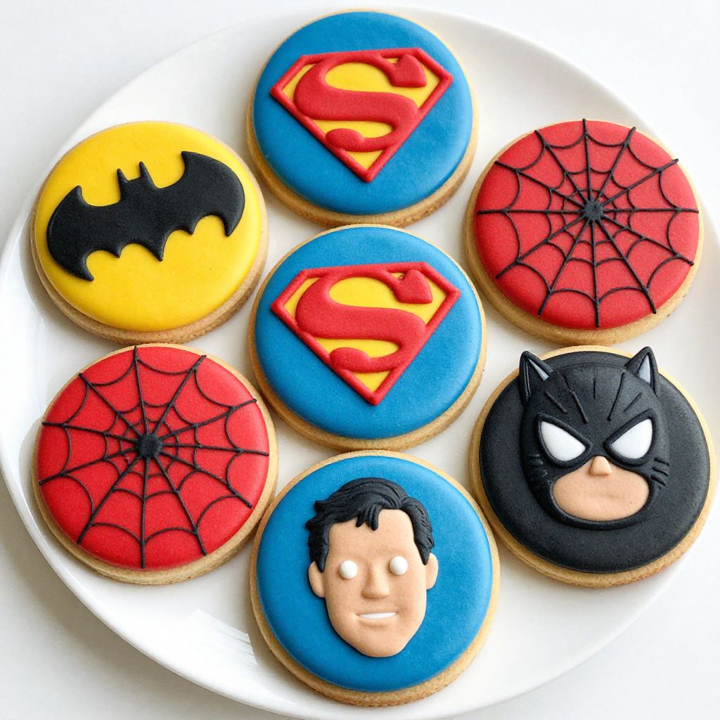 Photograph of colorful Superhero-themed cookies: Batman, Spider-Man, Superman, Captain America, and Spider-Man mask, each with detailed icing designs on