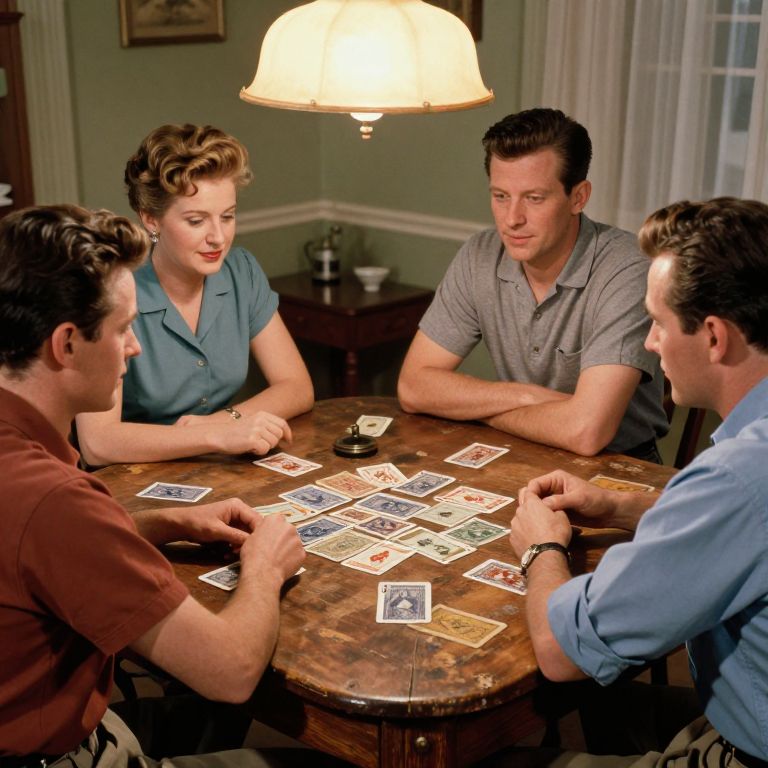 Vintage euchre game setting, four players sitting on old wooden chairs, cards spread on a timeworn table, soft warm lighting from an antique lamp, relaxed expressions, cozy homely atmosphere, detailed textures on cards and wood grain, nostalgic mood, 1950s style interior.