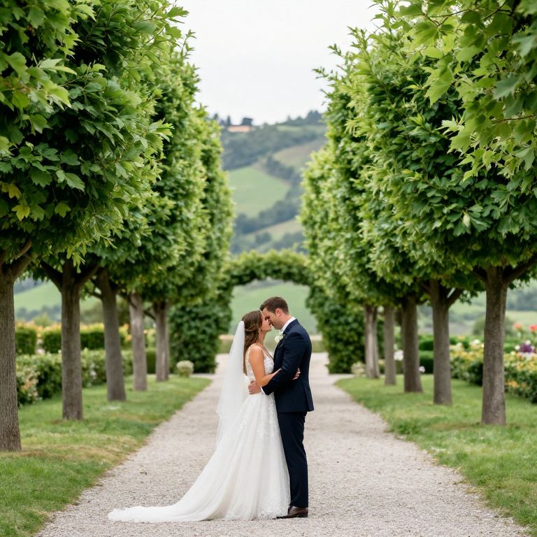 Photograph of a bride and groom kissing in a lush, tree-lined path. The bride wears a white, strapless, floor-length gown with a long veil, and the groom is in a dark blue suit. They stand in the center of a gravel path flanked by tall, green-leaved trees, creating a symmetrical, tunnel-like effect. In the background, rolling hills and a clear sky are visible. The couple's embrace is tender, with the groom's hands gently holding the bride's waist and the bride's arms around his neck. The scene is bright and romantic, capturing a moment of intimacy on their wedding day.