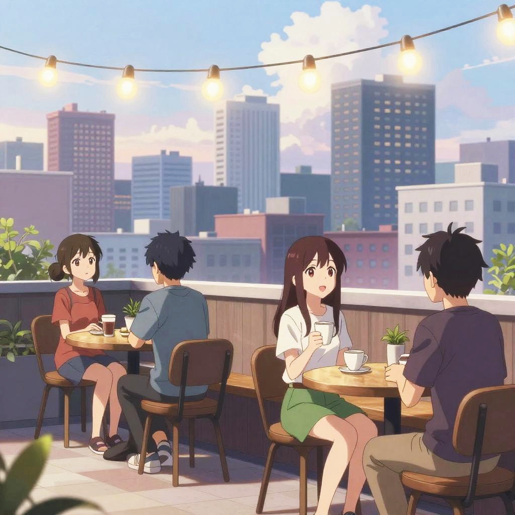 Anime cafe Atlanta rooftop setting, young anime characters chatting under string lights, city skyline background, pastel color palette, detailed anime style, whimsical and casual feel
