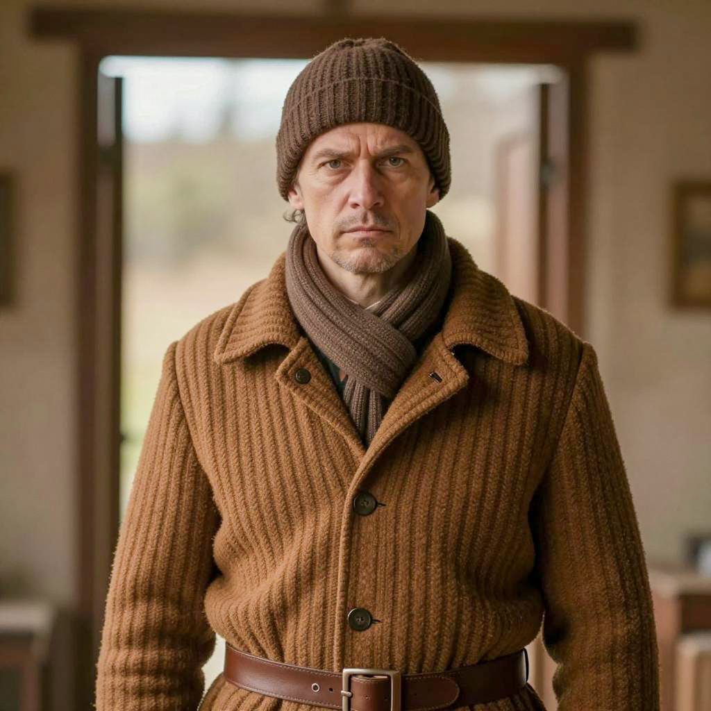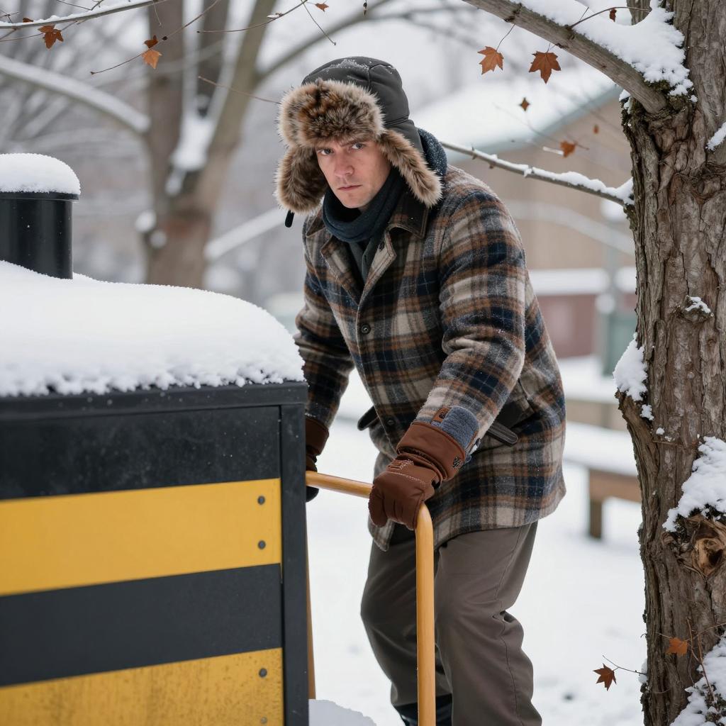 Man with scruffy beard, wearing plaid flannel jacket with fur hood, brown gloves, and holding a wooden tool, stands against a snow-covered tree. Background shows a frozen lake and leafless trees. Yellow-striped wooden bucket with grey cloth in foreground. Overcast sky. Winter setting. Intense facial expression.