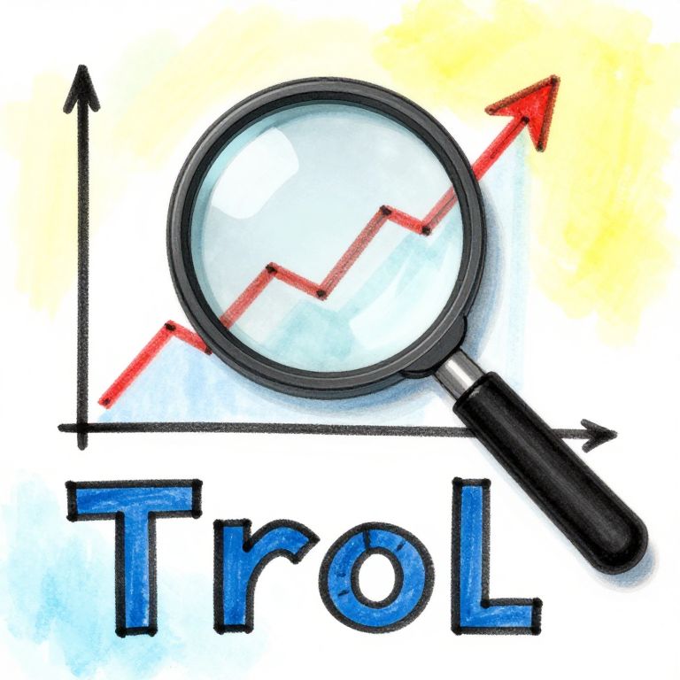 Troll magnifying glass and a chart with a upwards trend. hand drawn sketch style. colorful backgorund. letters in foreground.,