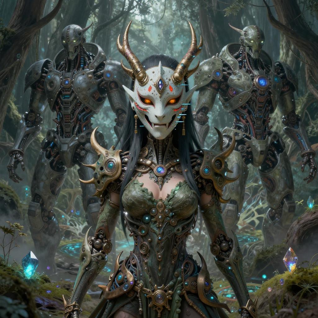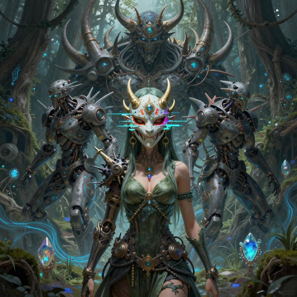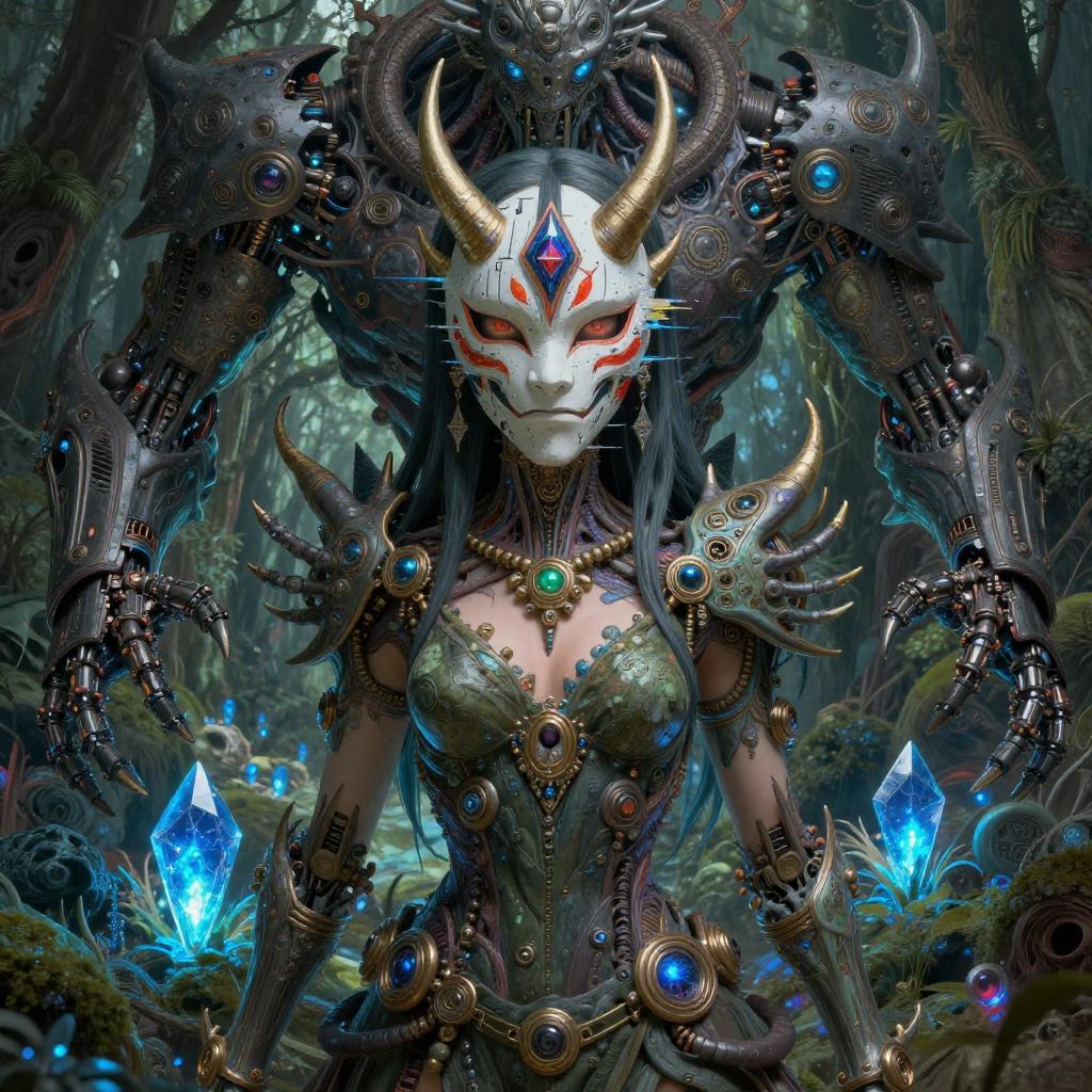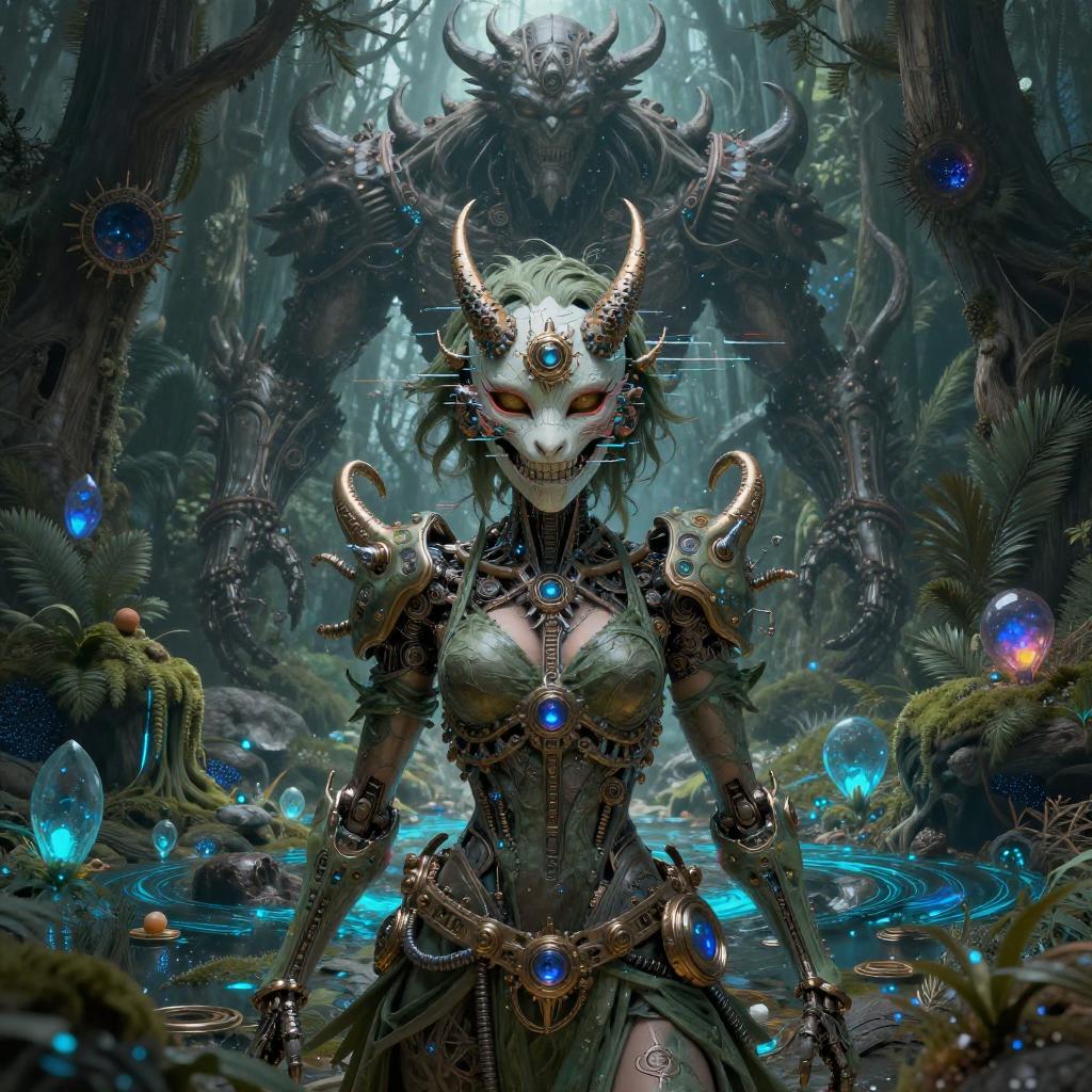 Cyborgdiffusion, Female anime character centered, oni mask, glitch art, glitchcore, organic, forest druid, dark souls boss, cyber punk, hellscape, portrait, male anime character, robot, masterpiece, intricate, highly detailed, sharp, technological rings, by james mccarthy, glowing blue lush seascape bioluminescent, by beeple and johfra bosschart, combination in the style ayami kojima, painting, 3 d render beeple, unreal engine render, intricate abstract, intricate artwork, by tooth wu, wlop, beeple, dan mumford. concept art, octane render, trending on artstation, greg rutkowski very coherent symmetrical artwork. cinematic, key art, hyper realism, high detail, 8 k, iridescent accents, albedo from overlord, the library of gems, intricate abstract. intricate artwork