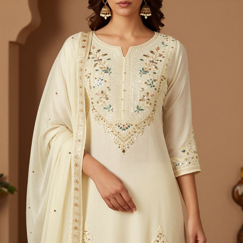 Elegantly styled woman wearing a cream-colored faux georgette salwar suit adorned with intricate sequined and embroidered floral patterns, complemented by a matching dupatta draped over her shoulders and accessorized with gold earrings and pearl embellishments.