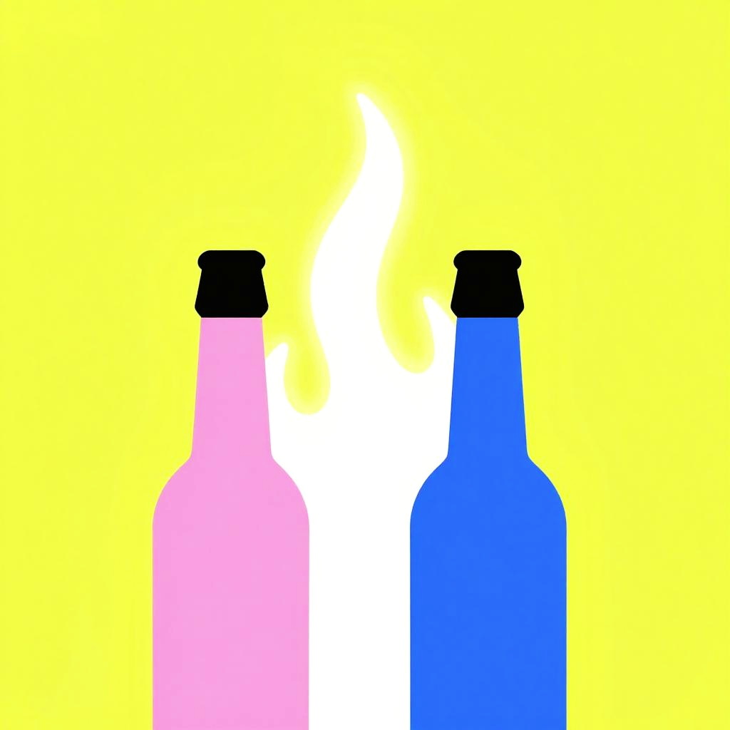 Digital art featuring two abstract bottles, one pink and one blue, standing side by side with black caps. Positioned against a bright yellow background, a large glowing white flame rises between the bottles, creating a vibrant and surreal composition.