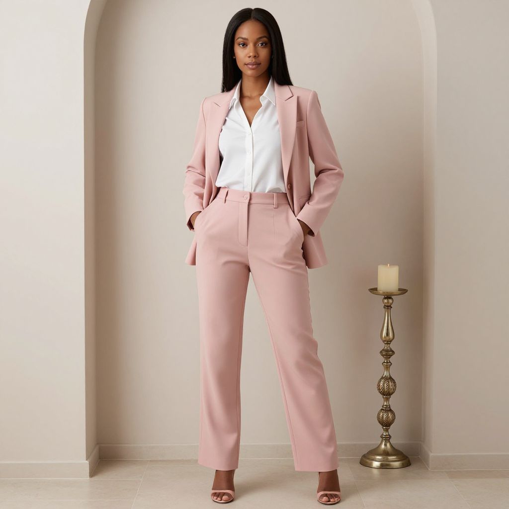 Photograph of a tall, slender Black woman with straight black hair, wearing a light pink tailored suit with a white button-down shirt. Her hands are in her pockets, and she stands confidently in front of a white arched doorway. She wears beige high-heeled sandals. To her right, there is a small, ornate brass candle holder with a lit white candle. The background is a clean, minimalist white, emphasizing her elegant attire. The image has a soft, natural light, highlighting the textures of the suit and her smooth skin.