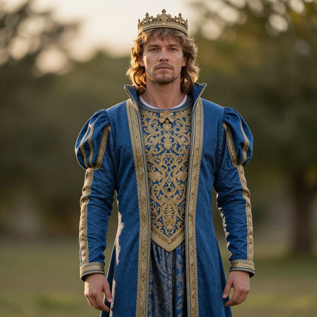A man dressed as a royal fantasy prince stands outdoors during golden hour, wearing an elaborate blue and gold embroidered costume with puffed sleeves and a regal crown. The photorealistic portrait captures the elegance and majesty of medieval-inspired fantasy style in a natural setting.