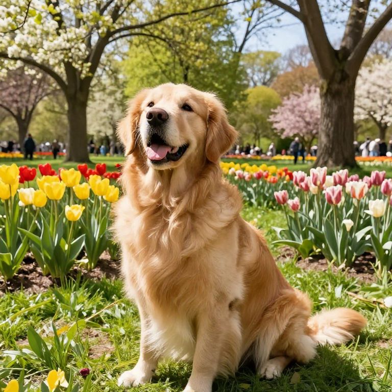 Golden retriever sitting on grass in a sunlit park, surrounded by colorful tulips (yellow, red, pink), with trees and people in the