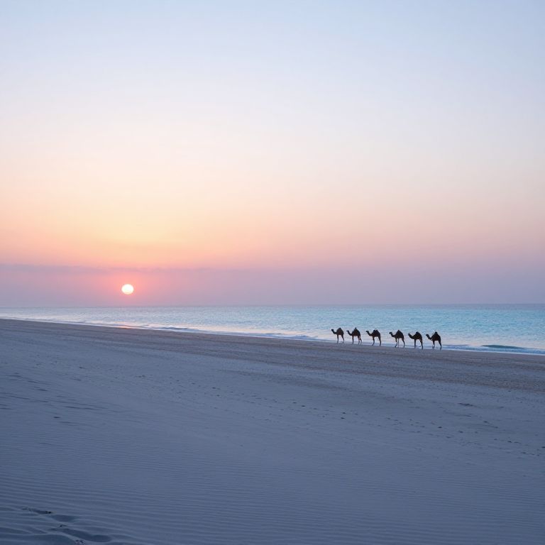 Photograph of a serene beach at sunset. The sky transitions from soft pink to light blue, with the sun low on the horizon. Five camels stand in a line near the shoreline, their silhouettes dark against the colorful sky and calm sea. The sand in the foreground is smooth with subtle ripples. The overall mood is peaceful and tranquil, with minimalistic composition focusing on the camels and the stunning sunset.
