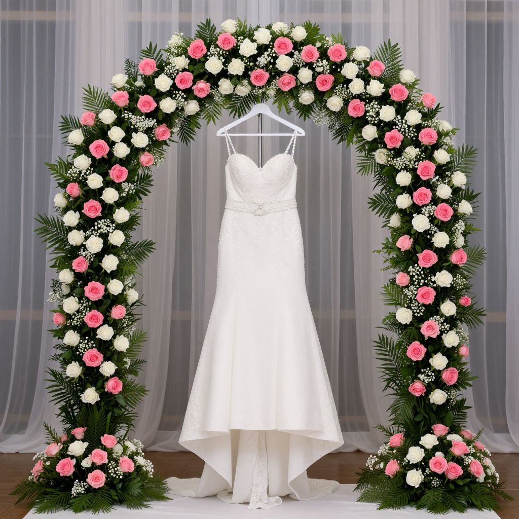Photograph of a white strapless wedding dress hanging on a white hanger, centered in an ornate floral arch with pink and white roses, green