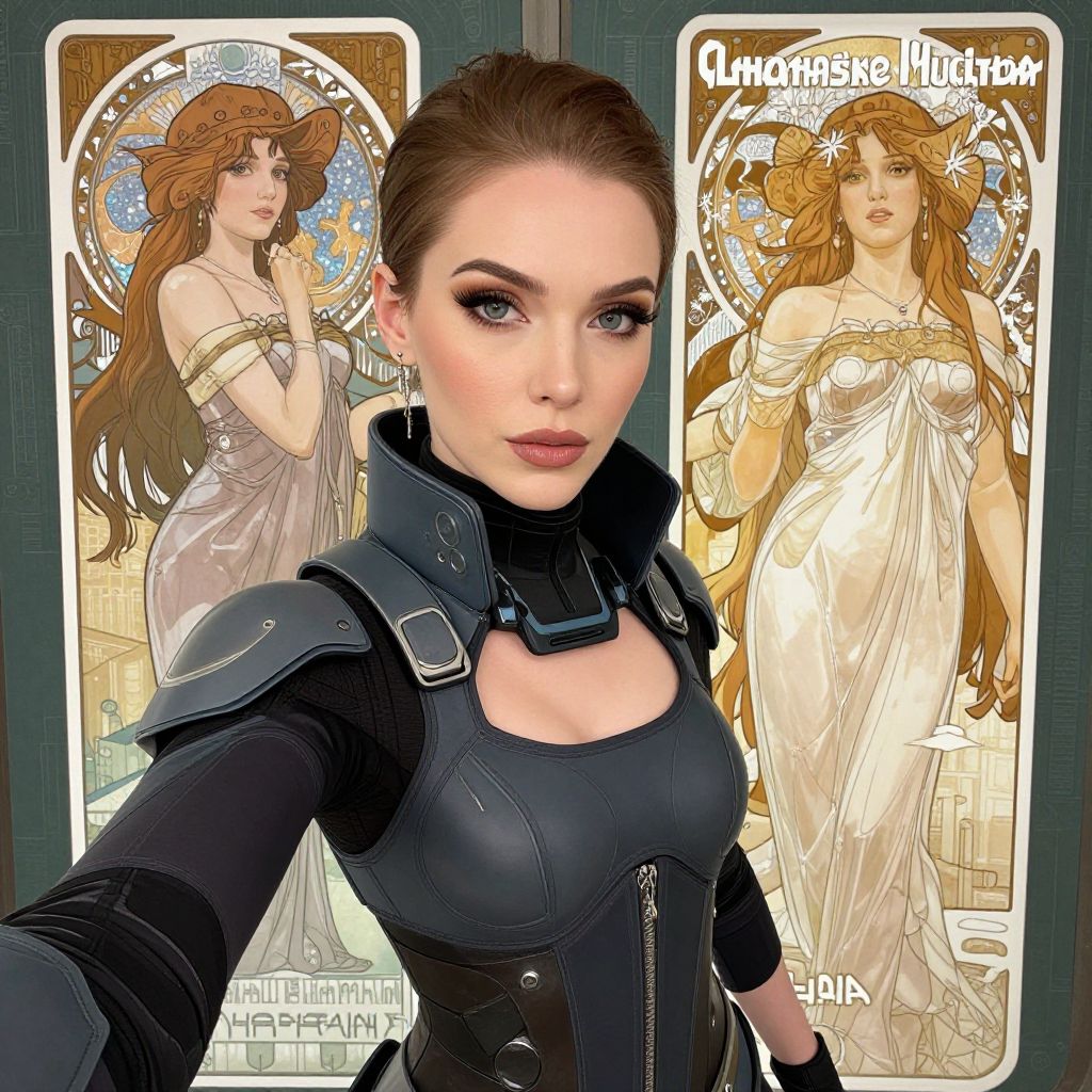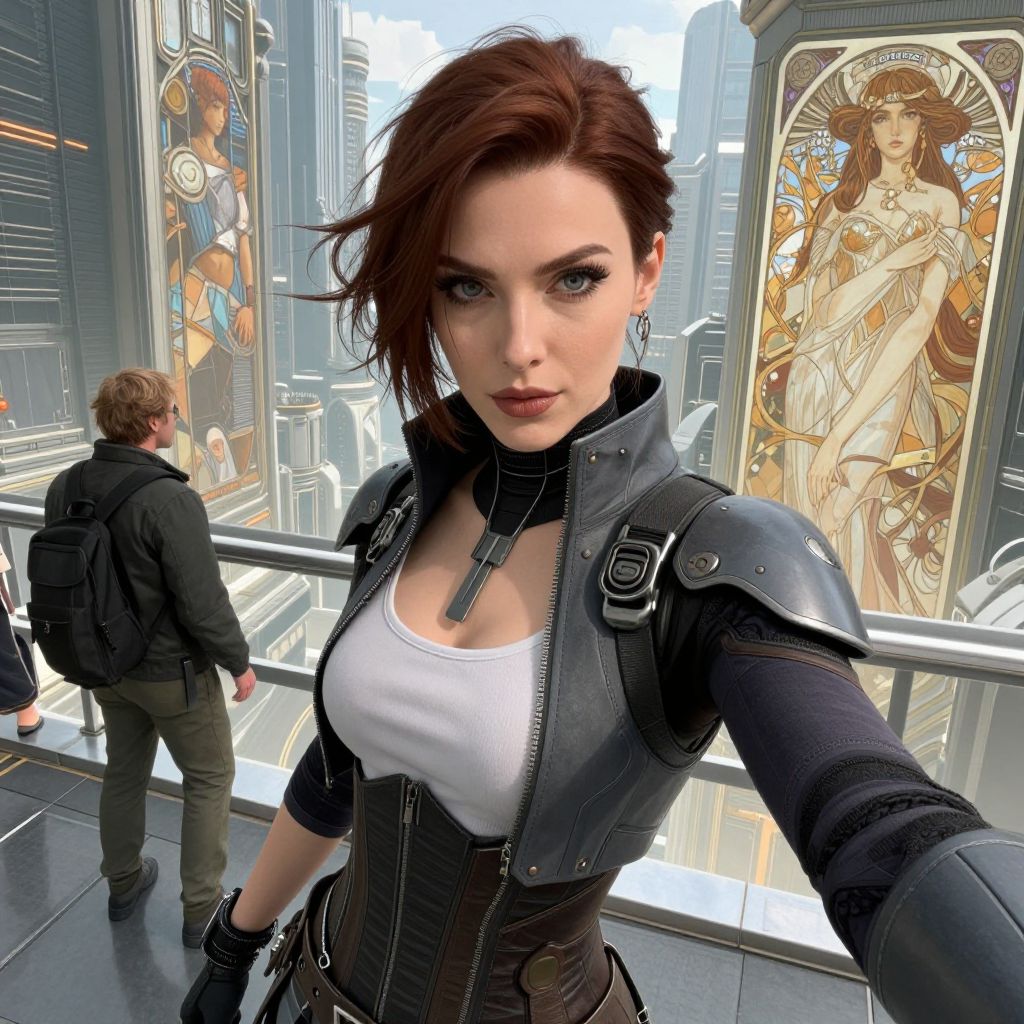 Woman wearing cyberpunk clothing in a sci - fi city, subsurface scattered skin, in the style of greg rutkowski and alphonse mucha and lisa frank, selfie