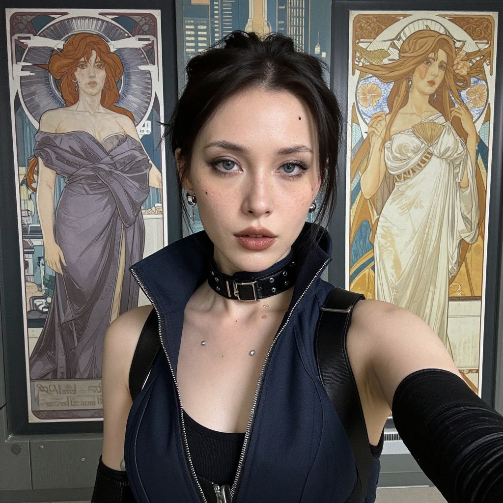 A photograph of a pale-skinned, dark-haired woman with blue eyes and small moles on her face, wearing a black, sleeveless, zip-up top with a high collar and a black choker. She has black arm warmers and a silver necklace with a small pendant. Her hair is pulled back, and she has a serious expression. Behind her are two framed, Art Nouveau-style illustrations of women with flowing hair and draped clothing; one in a purple dress, the other in a white dress. The background also shows a cityscape with tall buildings and a nighttime sky. The overall style is modern with vintage artistic influences.
