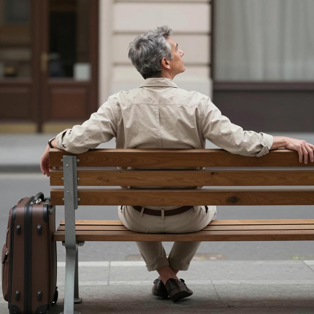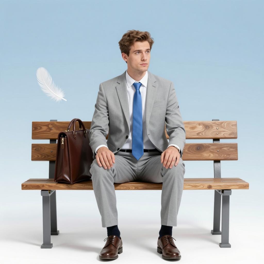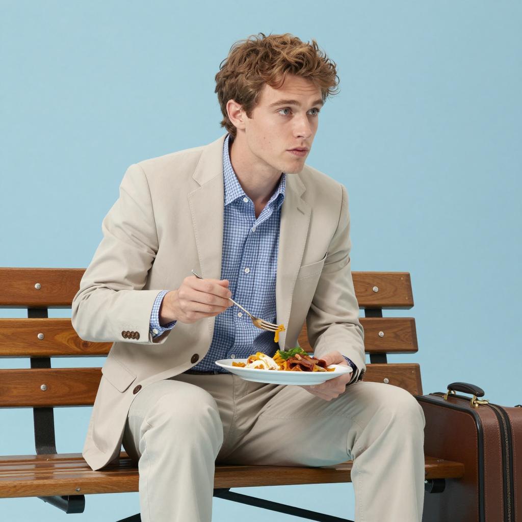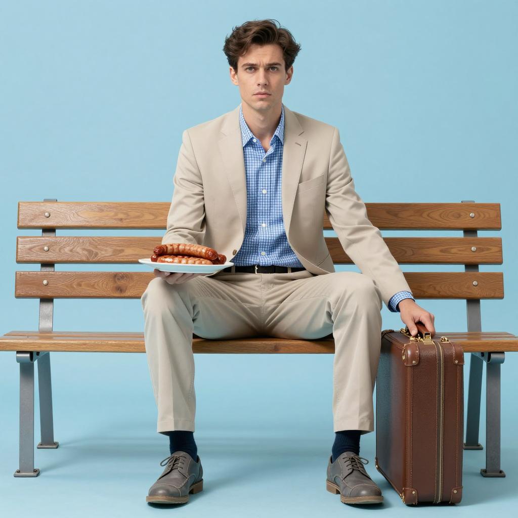 Man in beige suit, blue checkered shirt, and gray shoes sits on a wooden bench with metal supports. He holds a plate of sausages in his left hand and a brown suitcase in his right. Light blue background. Short, dark hair, serious expression. Wooden slats extend horizontally across the bench, metal supports at each end.