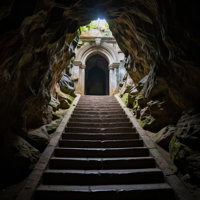 Staircase ascends through a dimly lit cavern, leading to an arched doorway framed by ancient stone, illuminated by ethereal light filtering from above.