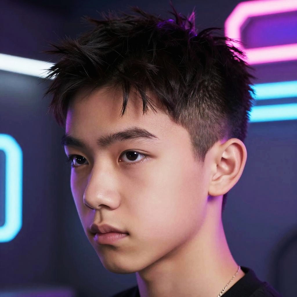 Teen crew cut style in a futuristic setting, young male character with clean, sharp hair, neon lights background, cyberpunk influence, intricate hair texture, vivid colors, cinematic lighting