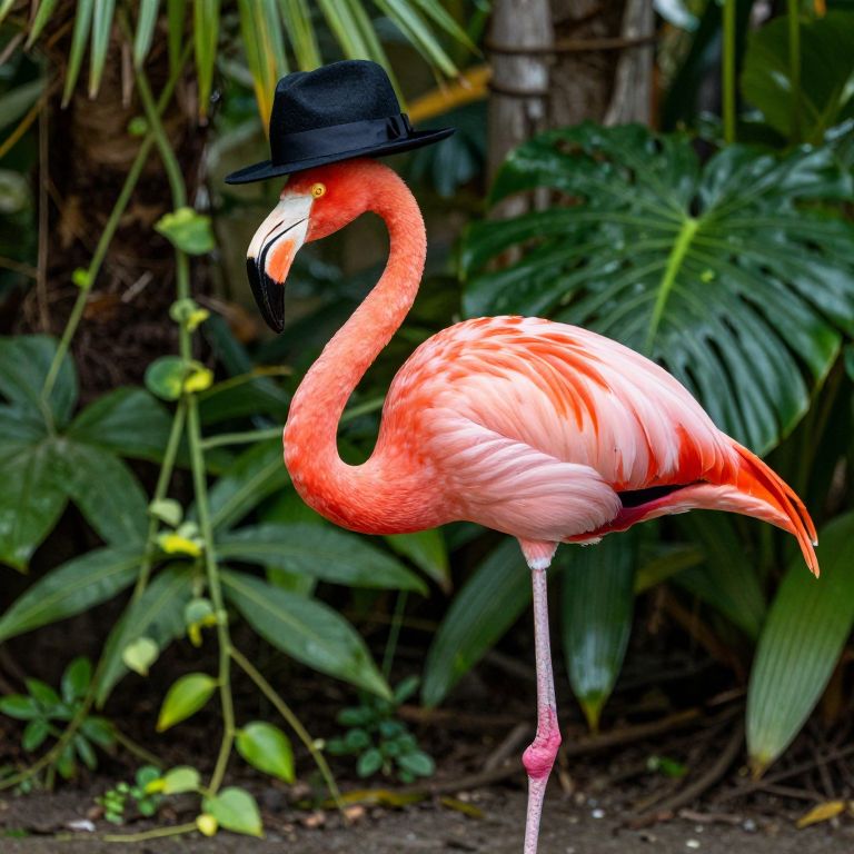 Photograph of a vibrant pink flamingo with white feathers, wearing a black fedora hat, standing on one leg in a lush, green tropical background
