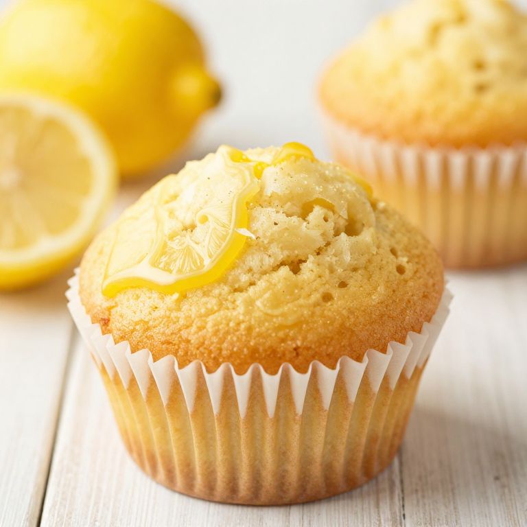Photograph of two lemon poppy seed muffins with golden-brown tops and white paper liners, positioned on a white wooden surface. The muffins are slightly textured with visible poppy seeds and lemon zest. In the blurred background, two bright yellow lemons are partially visible. The lighting is natural, highlighting the muffins' golden color and creating a warm, inviting atmosphere. The focus is on the muffin in the foreground, which is slightly closer to the camera.