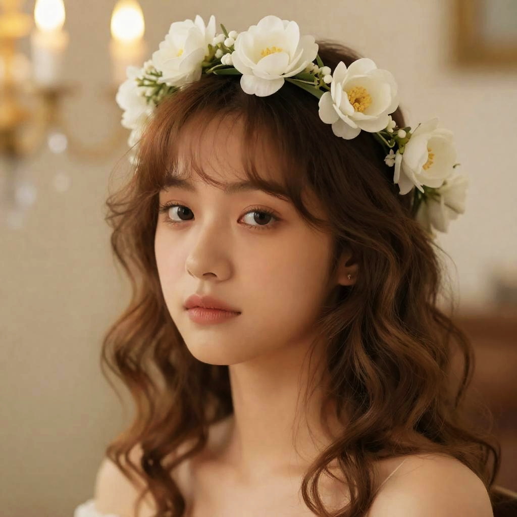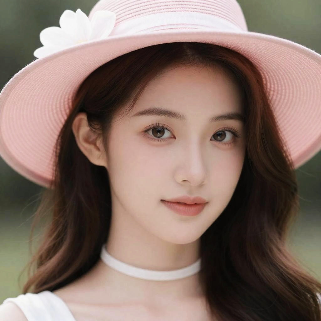 Young woman with fair skin and brown wavy hair, wearing a large pink sunhat with a white flower, and a white choker. Soft brown eyes, slight smile. Background is blurred. Close-up portrait.