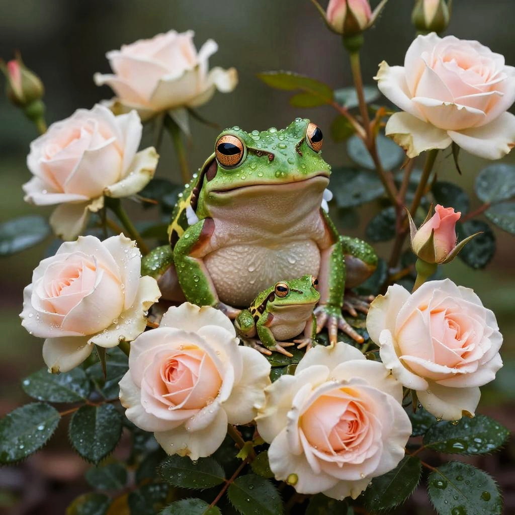 Delicate Roses with Tiny Green Frog