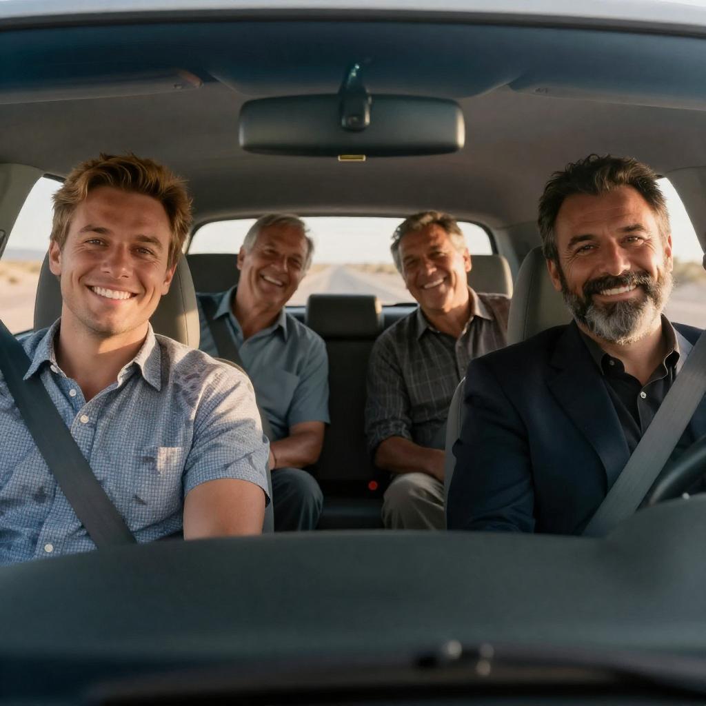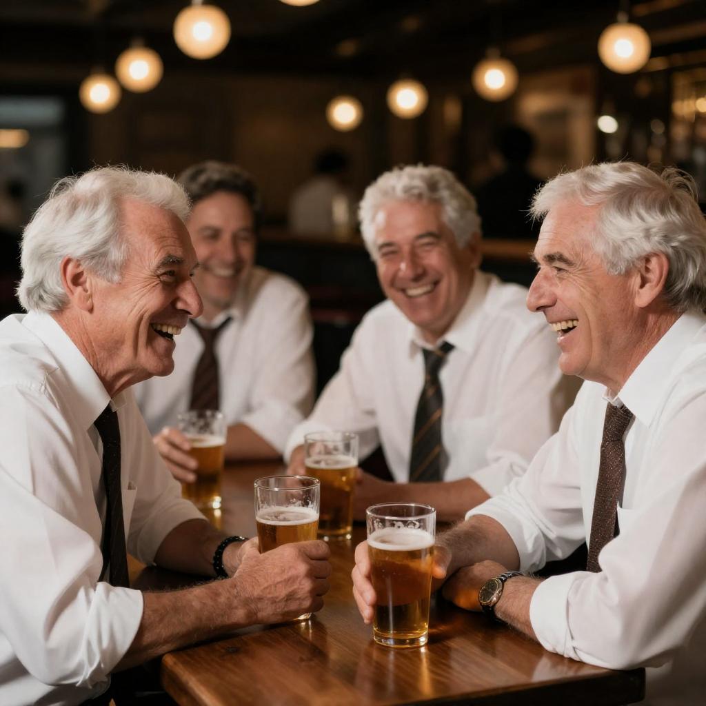 Photograph of five older men at a bar, laughing and drinking. Four men with white hair, one with dark hair, all wearing white shirts and ties. Glasses of beer on the table. Background is dimly lit, with other indistinct people. Men's faces show joy and amusement. One man in the foreground leaning forward, smiling broadly.