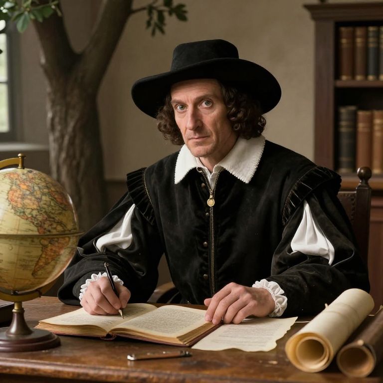Photograph of a Caucasian man with curly brown hair, wearing a black velvet doublet with white lace cuffs and a wide-brimmed black hat, seated at a wooden desk. He has a focused expression and is writing in an open book with a quill pen. A globe and rolled parchment are on the desk. The background includes a bookshelf with books and a tree trunk. The setting appears to be a historical study or library, with warm, muted lighting.