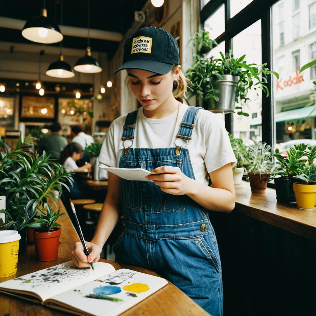 A young male artist wearing paint-stained denim overalls and a blue cap is sketching in a notebook with two pencils in a lively urban cafe. The cafe features hanging plants, wooden tables and stools, warm lighting, and large windows showing a street view. The scene has a nostalgic, warm, and cinematic atmosphere.