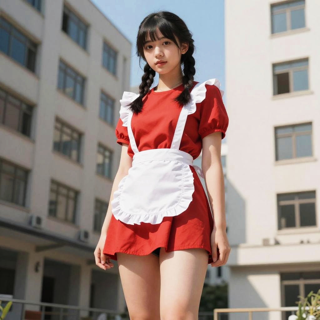 <(realistic:1.3), intricate details>, 1girl, legs, a girl at building, (((building))), braided bangs, braided ponytail, (solo:1.2), apron, thick thighs, side-tie panties, balck hair, 16yo, red dress, looking at viewer, sunlight