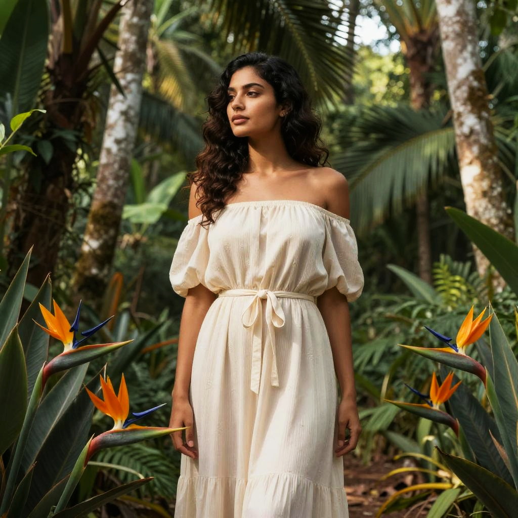 A photograph of a woman with wavy dark hair standing in a lush, tropical forest. She's wearing an off-the-shoulder, pale cream dress with delicate pleats and a tied waist. The forest is dense with tall trees, vibrant green leaves, and colorful bird-of-paradise flowers in the foreground. She looks calm and serene, with sunlight filtering through the trees, highlighting her dress.