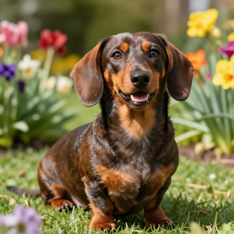 Chubby dachshund sitting playfully in a sunny garden, soft fur glistening, surrounded by colorful flowers, detailed and vibrant, hyper-realistic style.