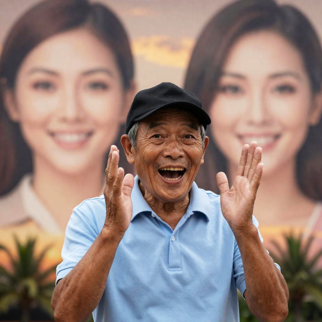 Group of elderly people standing outdoors, wearing yellow shirts and hats, with sunglasses and jewelry. One man in patterned hat and black shirt holds a microphone. Mixed facial expressions, some smiling, some neutral. Sunlit background with blurred greenery.