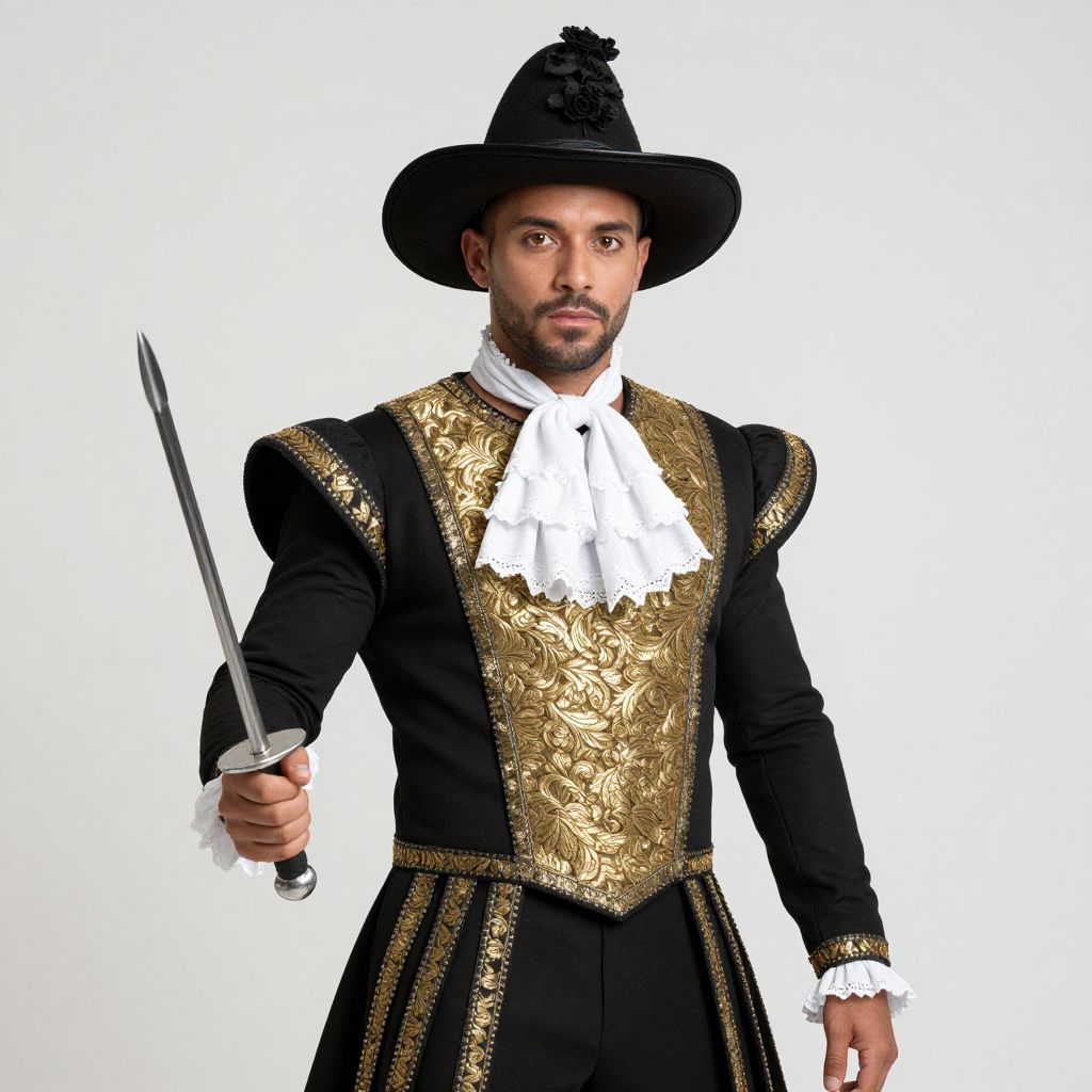 Man spanish fancy dress, man in a costume with a hat and a sword