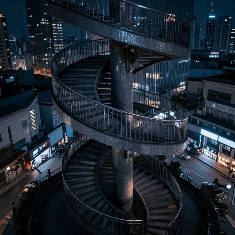 An enigmatic spiral staircase ascends amidst the glittering cityscape, its endless loops symbolizing the cyclical nature of existence, while the quiet hum of urban life below whispers of solitude and the eternal pursuit of transcendence.