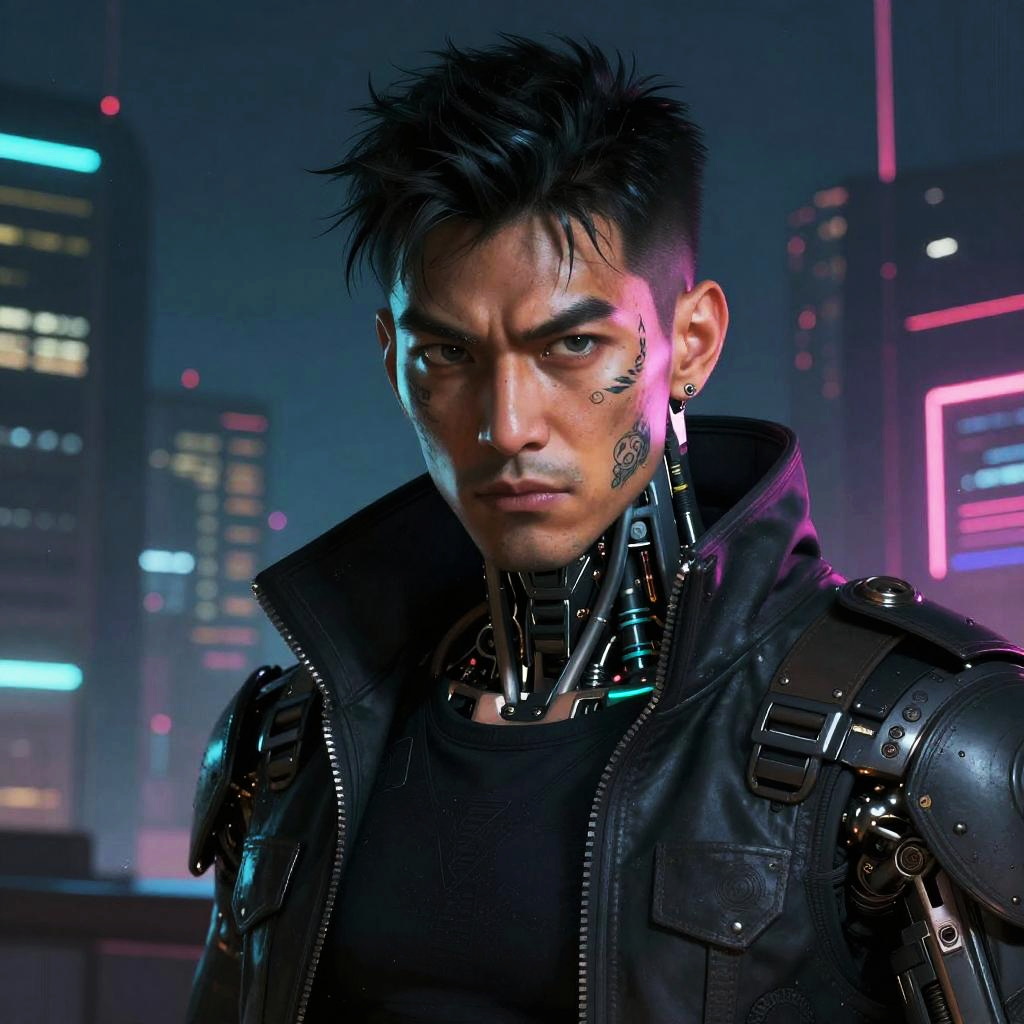 Character portrait creator free, cyberpunk character, neon-lit cityscape background, intense facial expression, glowing tattoos, detailed cybernetic implants, contrasting shadows and highlights, gritty texture with painterly brushwork