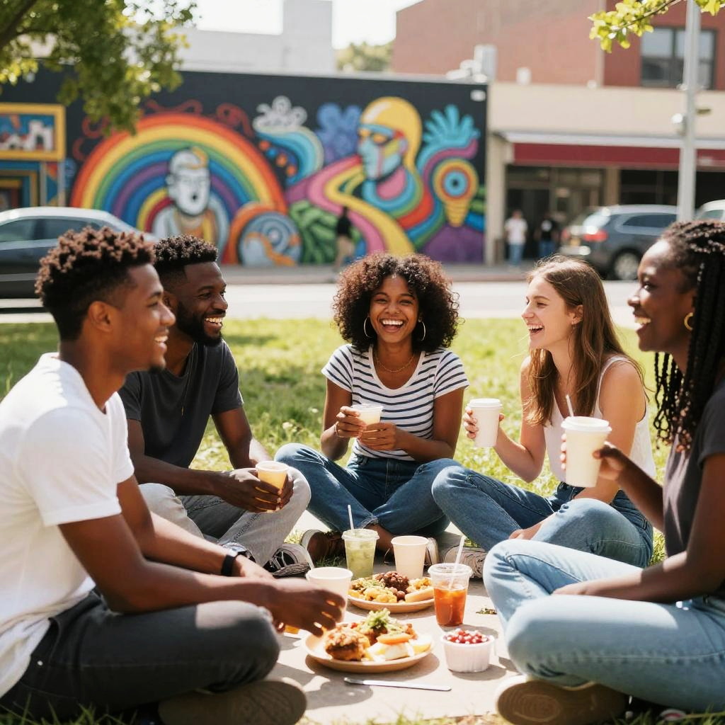 Photograph of five diverse friends, laughing and eating outdoors on a sunny day, with vibrant graffiti and rainbow mural in the background.