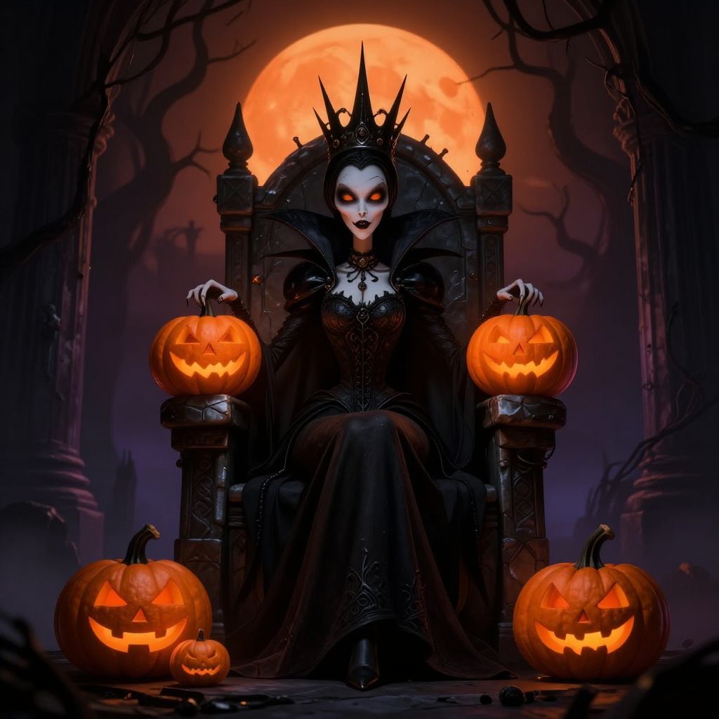Digital art of a gothic queen with pale skin, black crown, and dress, seated on an ornate throne, surrounded by glowing jack-o'-