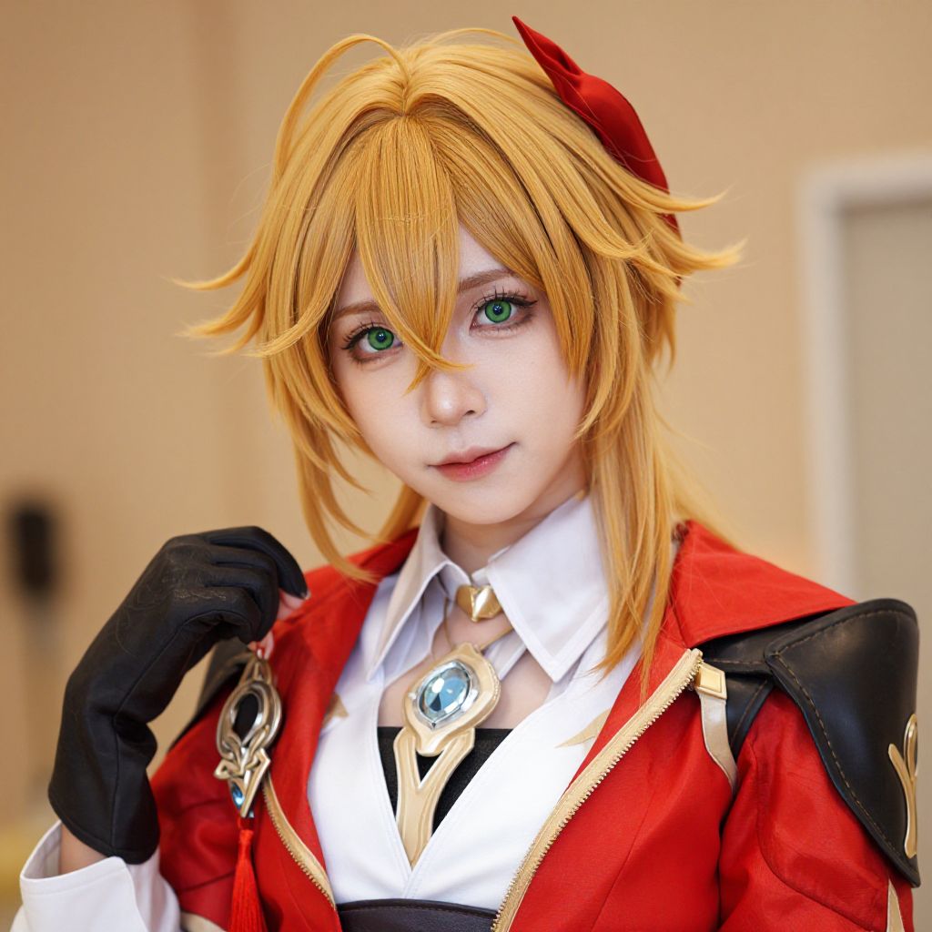 Photograph of a young woman cosplaying as a character with light blonde hair, green eyes, and fair skin. She wears a red and black jacket with gold accents, a white shirt, black gloves, and a large blue gem on a gold pendant around her neck. Her hair is styled with loose strands framing her face, and a red bow is on the right side. She holds her black-gloved hands near her face. The background is a softly blurred beige interior. The image has a high-detail, vibrant color style, emphasizing the character's intricate costume and expressive eyes.