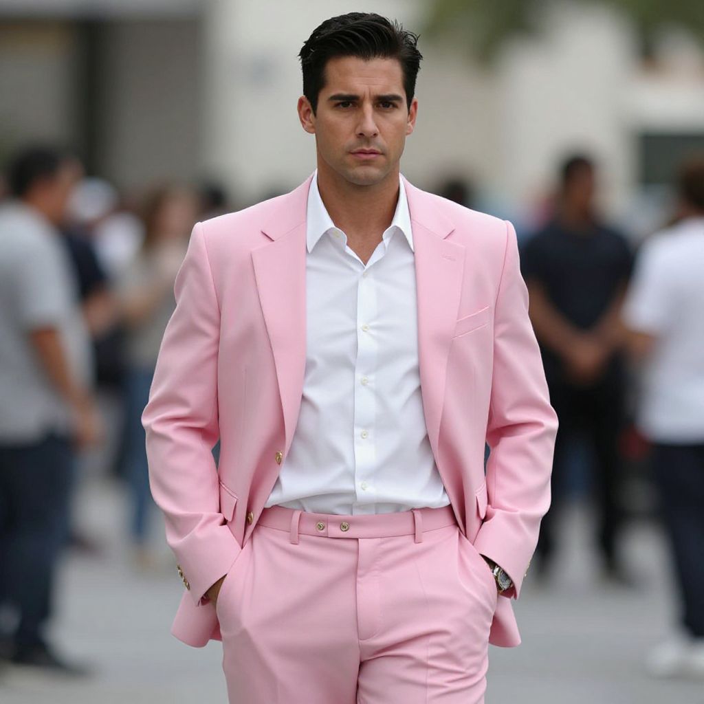 Miami vice costume fancy, 1boy, male focus, hands in pockets, jacket, shirt, solo, blurry background, pants, suit, white shirt, outdoors, formal, blurry, collared shirt, black hair, looking at viewer, pink pants, pink jacket, realistic, cowboy shot, open clothes