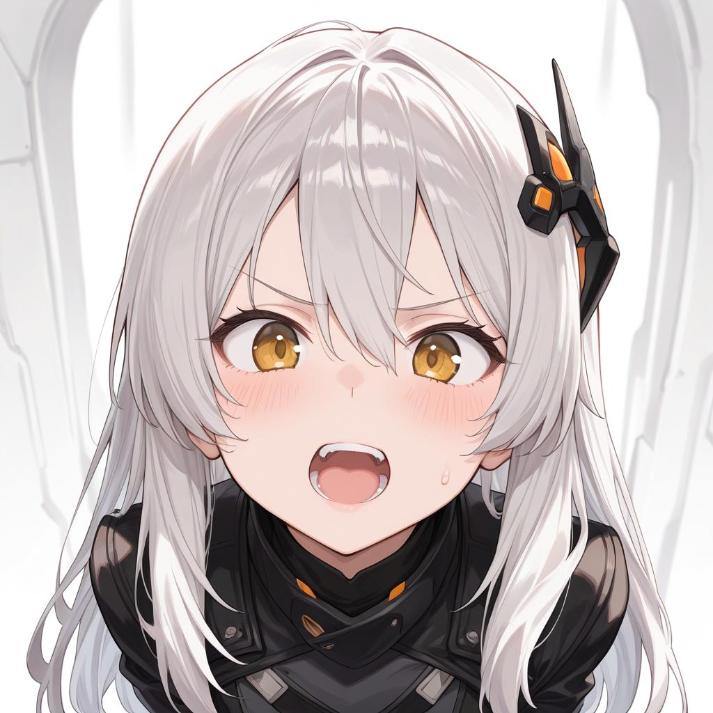 (masterpiece:1.3), (best quality:1.2), 8k, absurdres, unity 8k wallpapper, (extremely detailed:1.3), highestres, 1girl, fangs, cute, white hair, upper body