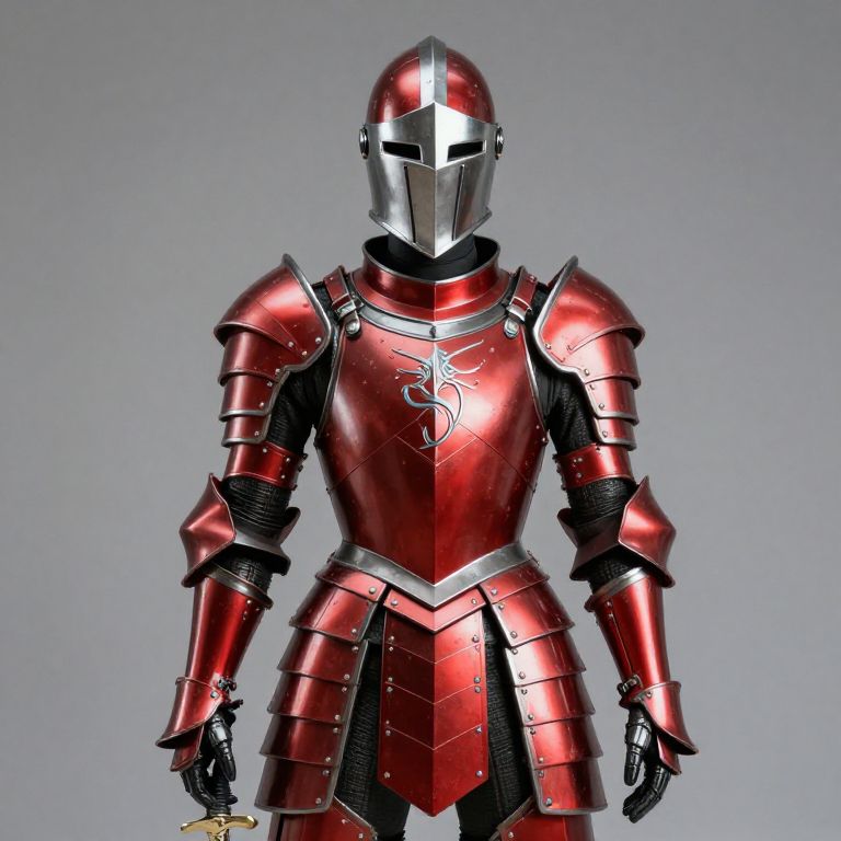 Mannequin wearing a red and silver armor with a helmet and a sword.
