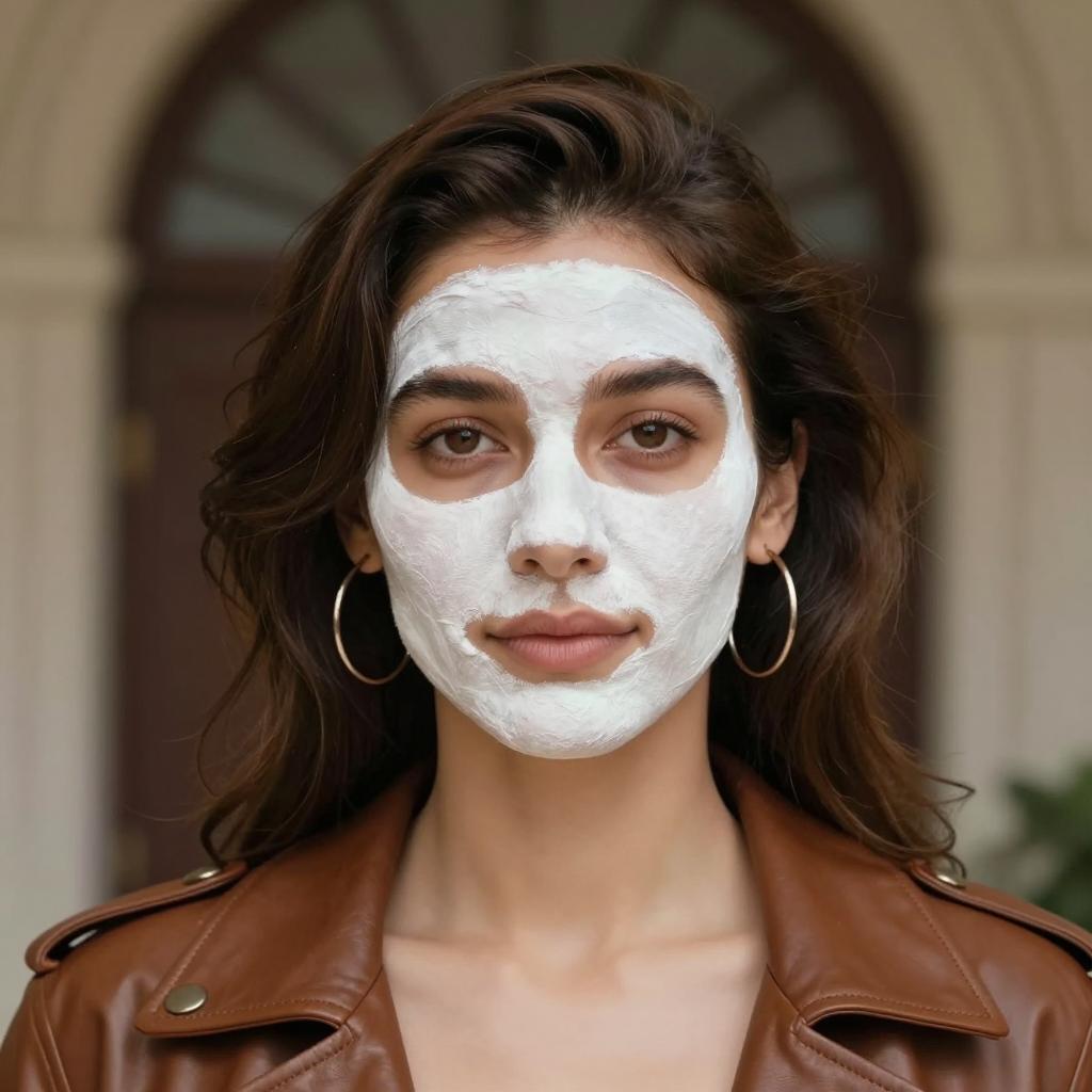 Close-up portrait of a woman with brown wavy hair wearing a brown leather jacket and large hoop earrings. She has a white facial mask applied across her face, creating a mask-like stripe effect. The background is softly blurred with an architectural door and arch, featuring soft lighting and a slightly warm color tone.