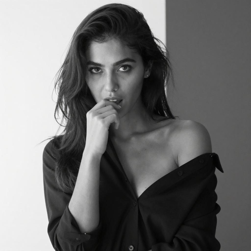 Black-and-white photograph of a woman with long, dark hair and dark eyes, wearing a black, off-shoulder top that reveals a hint of cleavage. She is biting her finger, gazing intently at the camera. The background is a bright, white light source on the left, contrasting with the dark, ured wall on the right.