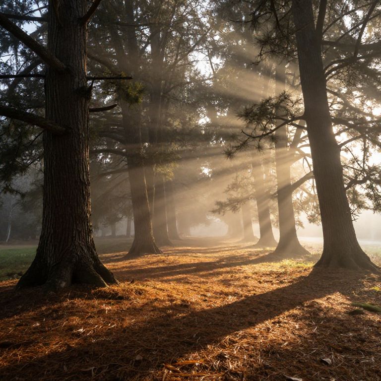 Photograph of a sunlit forest at dawn. Tall, dark brown pine trees with rough bark stand in the foreground and background, casting long shadows on the ground covered in brown pine needles. Sunlight beams through the trees, creating a misty, ethereal glow in the background. The light filters through the dense foliage, highlighting the textures of the tree trunks and the forest floor. The overall scene has a tranquil, almost magical atmosphere with contrasting dark shadows and bright, golden light.
